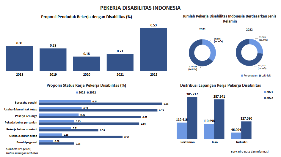 Visualisasi ini menampilkan data mengenai pekerja dengan disabilitas di Indonesia. Termasuk status pekerjaan dan distribusi lapangan pekerjaannya. Data tersebut dapat diakses melalui website BPS. Data yang ditampilkan update per September 2023.