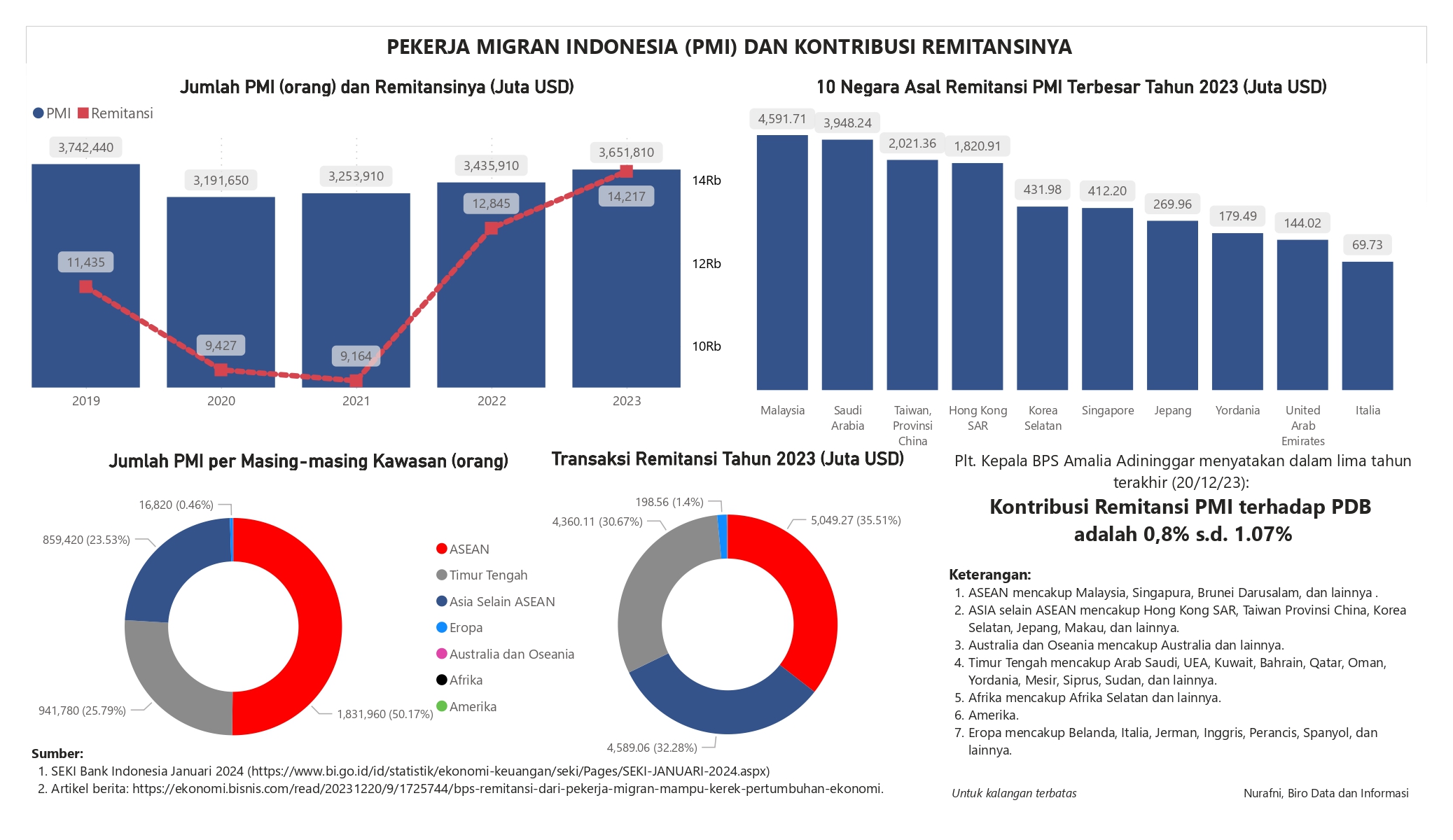 Visualisasi menampilkan total Pekerja Migran Indonesia (PMI) yang prosedural dan kontribusinya remitansinya per tahun. Data menunjukkan total PMI dalam 5 (lima) tahun terakhir mengalami tren peningkatan. Pada tahun 2023, tercatat ada sejulam 3.651.810 orang PMI dengan remitansinya adalah 14.217 juta USD. Negara asal remitansi PMI yang tertinggi adalah Malaysia dengan jumlah sebesar 4.591,71 juta USD.