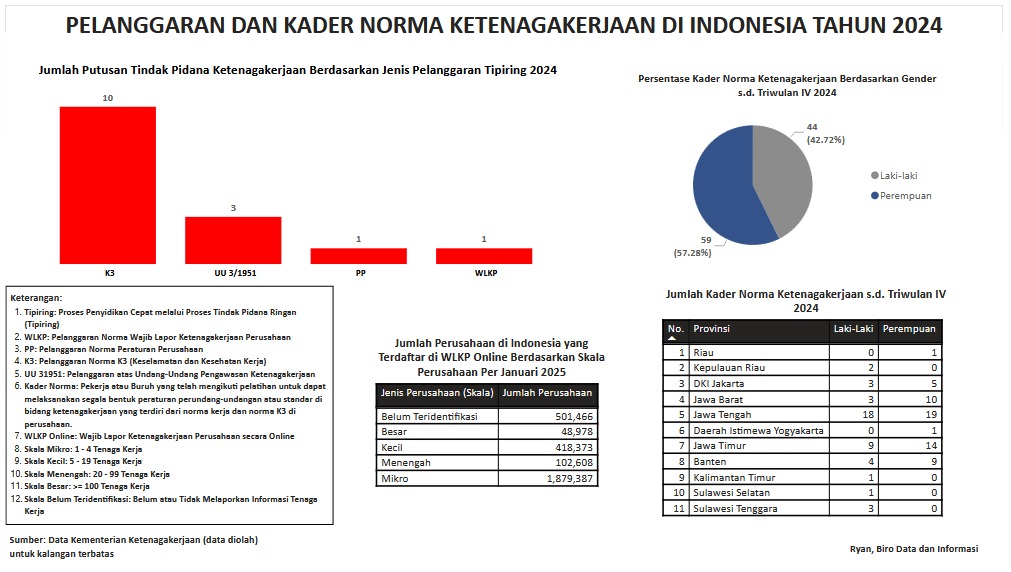 Visualisasi ini menyajikan data terkait putusan tindak pidana ketenagakerjaan berdasarkan jenis pelanggaran tipiring (tindak pidana ringan) serta jumlah perusahaan yang terdaftar WLKP Online dan jumlah kader norma ketenagakerjaan di Indonesia.