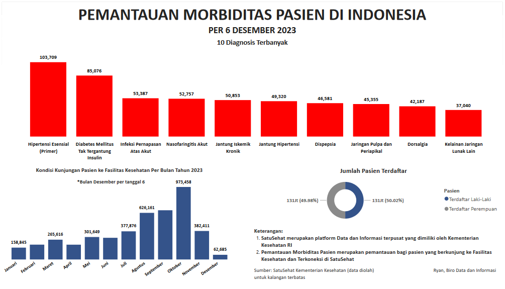 Visualisasi ini menampilkan beberapa data yang terdiri dari 10 Diagnosis penyakit terbanyak di Indonesia, Kondisi Kunjungan Pasien ke Fasilitas Kesehatan (Faskes) per Bulan sepanjang tahun 2023, serta Jumlah Pasien Terdaftar di SatuSehat Kementerian Kesehatan. Pemantauan Morbiditas Pasien ini merupakan pemantauan bagi pasien yang berkunjung ke fasilitas kesehatan dan terkoneksi di Satusehat.