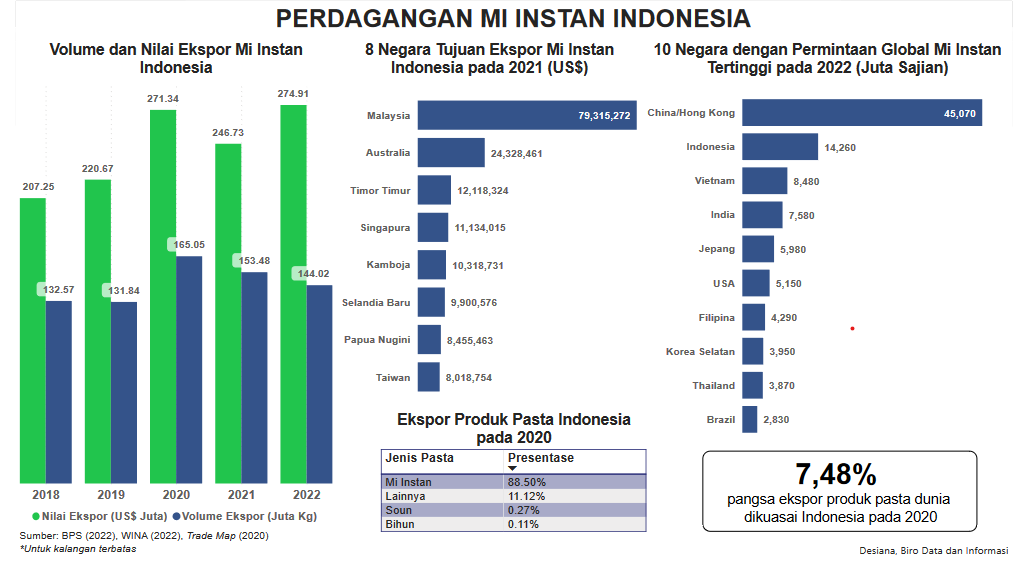 Visualisasi ini menampilkan data volume dan nilai ekspor Mi Instan Indonesia pada tahun 2018-2022, 8 negara tujuan ekspor mi instan Indonesia pada 2021, 10 negara dengan permintaan global mi instan tertinggi pada tahun 2022, dan presentase ekspor produk pasta Indonesia pada tahun 2020. Data dapat diakses melalui BPS, WINA, dan Trade Map. Data yang ditampilkan update per Juni 2023.