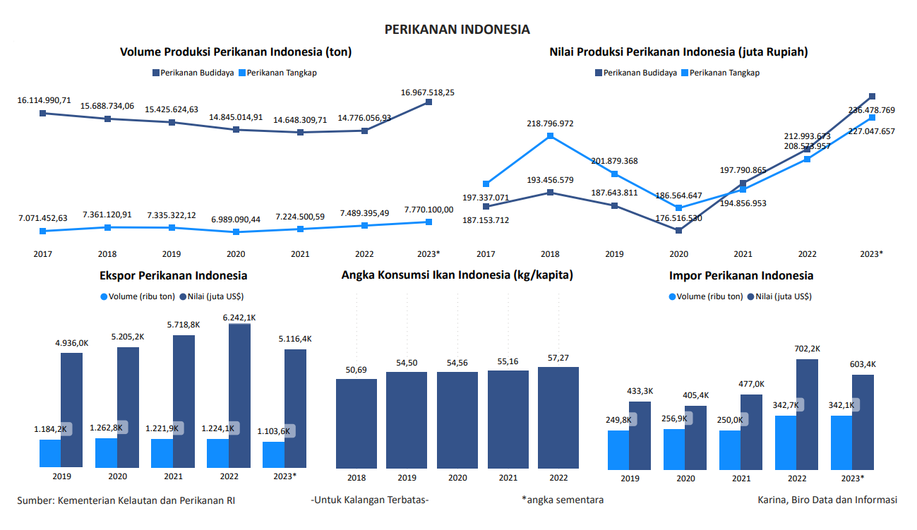Visualisasi ini menampilkan data Volume Produksi Perikanan Indonesia, Nilai Produksi Perikanan Indonesia, Ekspor Perikanan Indonesia, Impor Perikanan Indonesia, dan Angka Konsumsi Ikan Indonesia. Data bersumber dari Kementerian Kelautan dan Perikanan RI.