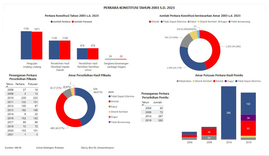 Visualisasi mengenai perkara di Mahkamah Konstitusi di MK sejak awal berdiri tahun 2003 s.d. 2023. Informasi yang termuat antara lain jumlah perkara berdasarkan amar, penanganan perkara perselisihan pilkada, dan amar putusan perkara pemilu. Data diolah dari MK RI.