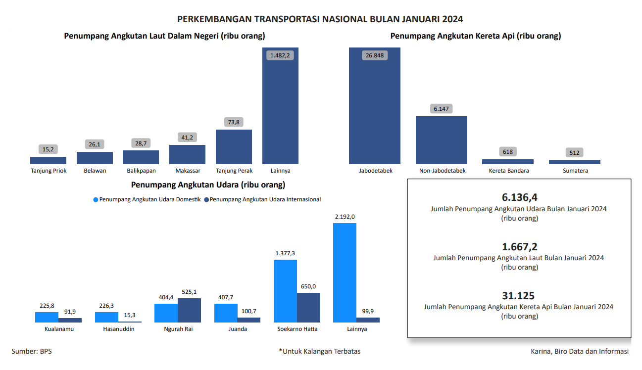Visualisasi ini menampilkan data jumlah penumpang angkutan udara, angkutan laut, dan angkutan kereta api pada bulan Januari 2024. Data bersumber dari BPS.