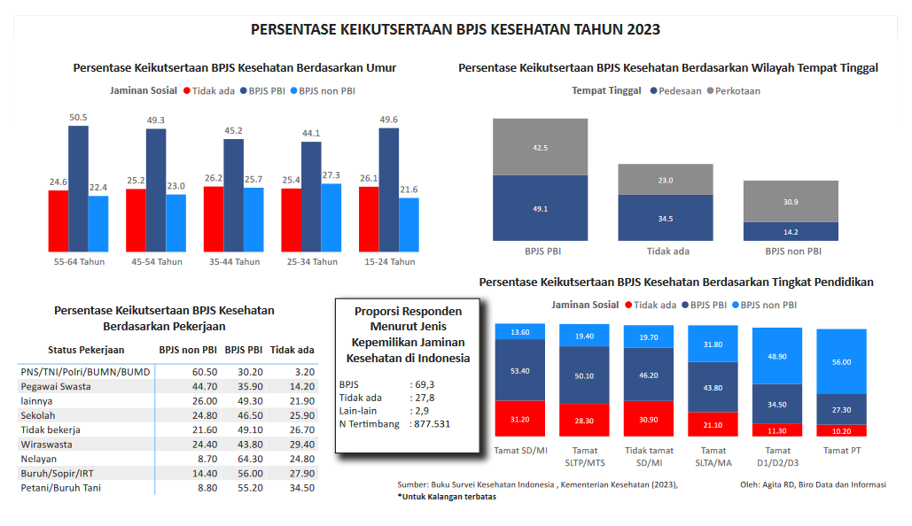 Visualisasi ini menampilkan data persentase keikutsertaan BPJS Kesehatan Tahun 2023, berdasarkan data Survei Kesehatan Indonesia yang dikeluarkan oleh Kementerian Kesehatan.