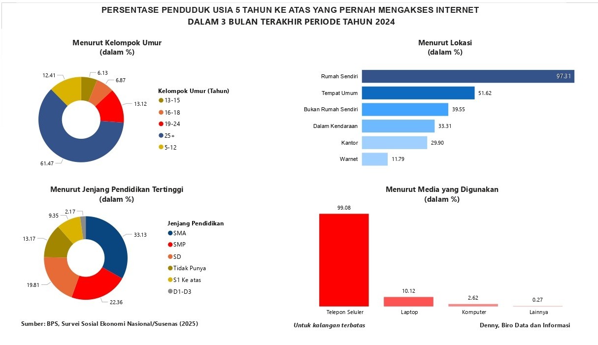 Visualisasi ini menjelaskan tentang persentase penduduk usia di atas 5 tahun yang pernah mengakses internet di 3 bulan terakhir periode tahun 2024 yang diklasifikasikan berdasarkan kelompok umur, jenjang pendidikan tertinggi, lokasi akses, dan media yang digunakan.