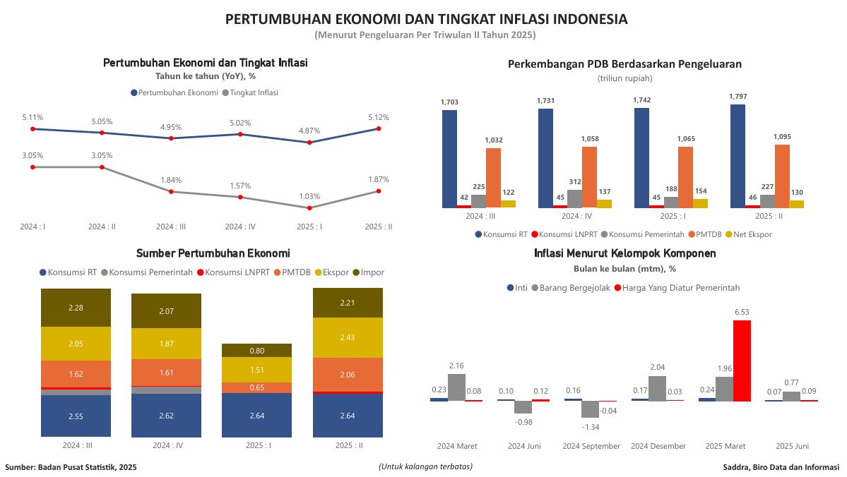 Visualisasi ini menunjukkan pertumbuhan Ekonomi Indonesia berdasarkan pertumbuhan PDB (produk domestik bruto) tahun ke tahun (yoy) atas dasar harga konstan dari tahun 2024 triwulan I s.d. tahun 2025 triwulan II, dan sumber pertumbuhan ekonomi berdasarkan pengeluaran tahun 2024 triwulan III s.d. 2025 triwulan II, serta perkembangan tingkat inflasi tahun ke tahun (yoy) dan perkembangan inflasi menurut kelompok komponen untuk periode bulan Maret, Juni, September dan Desember 2024, serta bulan Maret dan Juni 2025. Data bersumber dari website Badan Pusat Statistik per tanggal 25 Agustus 2025.