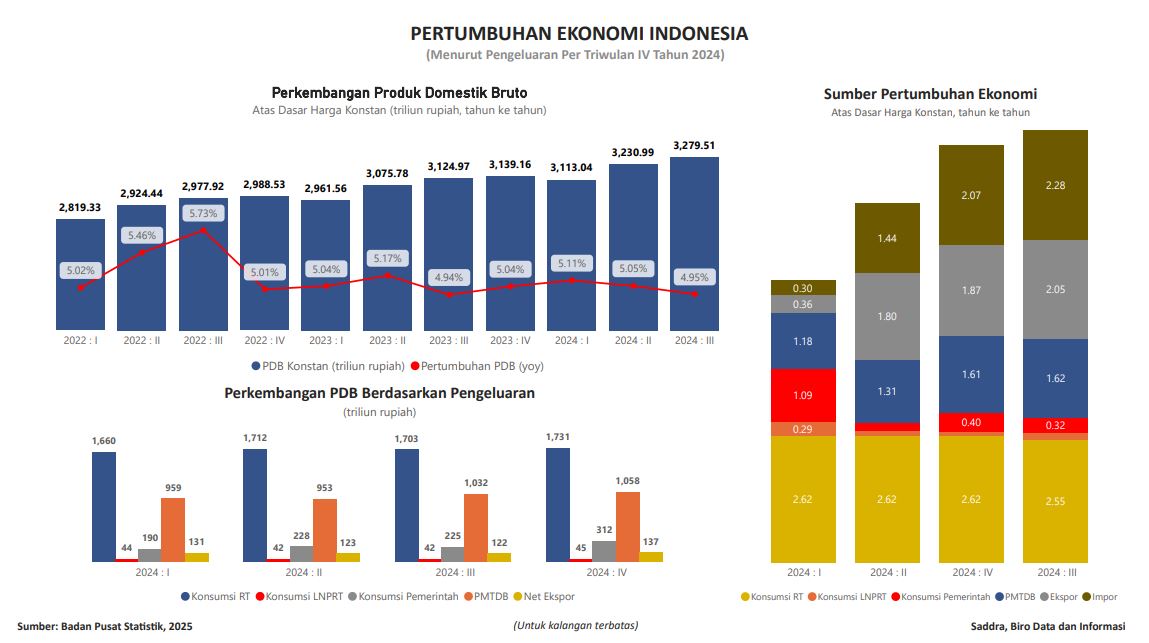 Visualisasi ini menunjukkan pertumbuhan Ekonomi Indonesia berdasarkan pertumbuhan PDB (produk domestik bruto) tahun ke tahun (yoy) atas dasar harga konstan dari tahun 2022 triwulan I s.d. tahun 2024 triwulan IV, dan sumber pertumbuhan ekonomi berdasarkan pengeluaran khusus tahun 2024 triwulan I s.d. triwulan IV (diolah), serta perkembangan PDB atas dasar harga berlaku dan harga konstan tahun ke tahun (yoy). Data bersumber dari website Badan Pusat Statistik per tanggal 28 Februari 2025.