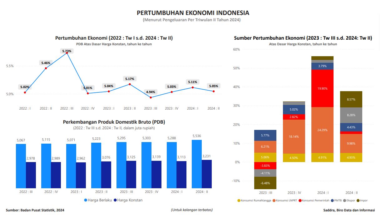 Visualisasi ini menunjukkan pertumbuhan Ekonomi Indonesia berdasarkan pertumbuhan PDB (produk domestik bruto) tahun ke tahun (yoy) atas dasar harga konstan dari tahun 2022 triwulan I s.d. tahun 2024 triwulan II, dan sumber pertumbuhan ekonomi berdasarkan pengeluaran khusus tahun 2023 triwulan III s.d. tahun 2024 triwulan II (diolah), serta perkembangan PDB atas dasar harga berlaku dan harga konstan tahun ke tahun (yoy). Data bersumber dari website Badan Pusat Statistik per tanggal 25 Oktober 2024.