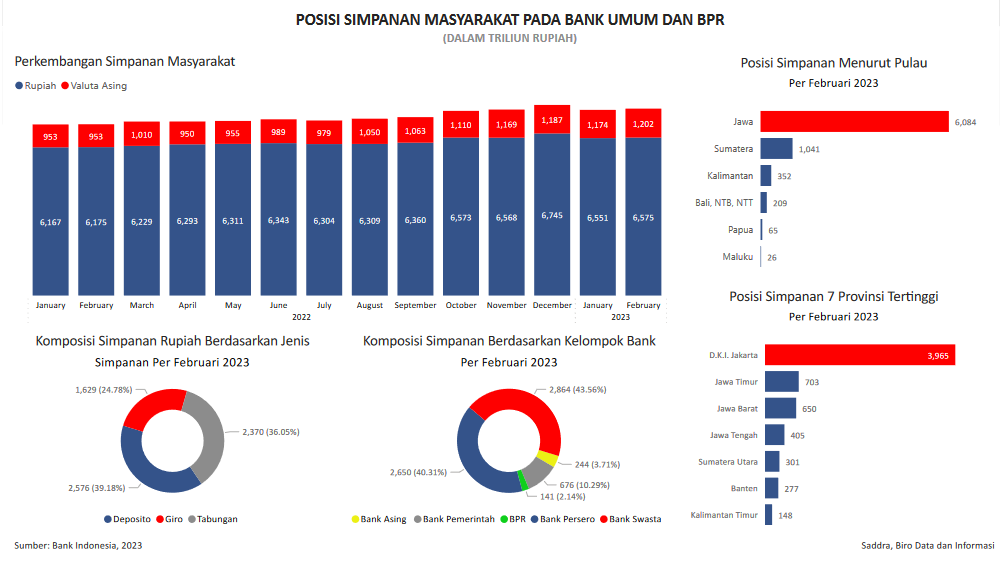 Visualisasi yang ditampilkan data perkembangan posisi simpanan masyarakat Indonesia pada Bank Umum dan BPR. Data dapat diakses melalui website Badan Pusat Statistik. Data yang ditampilkan update bulan Februari 2023.