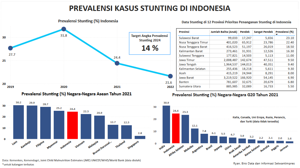 Visualisasi ini menampilkan data mengenai prevalensi stunting dari tahun 2019 hingga tahun 2022 beserta target stunting di tahun 2024. Terdapat juga data stunting di 12 provinsi yang menjadi provinsi prioritas penurunan angka stunting di Indonesia. Selain data prevalensi stunting di Indonesia, juga terdapat data prevalensi stunting di berbagai negara seperti negara-negara ASEAN dan negara-negara peserta G20.