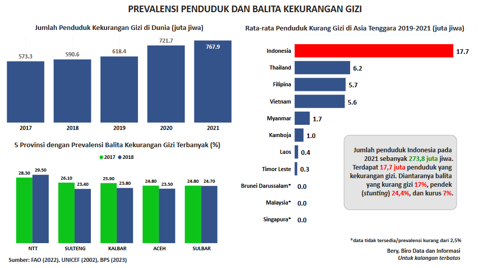 Visualisasi ini menampilkan prevalensi kekurangan gizi pada penduduk, dan balita secara khusus, di Indonesia serta lima provinsi dengan prevalensi balita kekurangan gizi terbanyak. Data diperoleh dan dapat diakses melalui laman FAO, Unicef, dan BPS. Data yang ditampilkan berdasarkan update per Juni 2023.