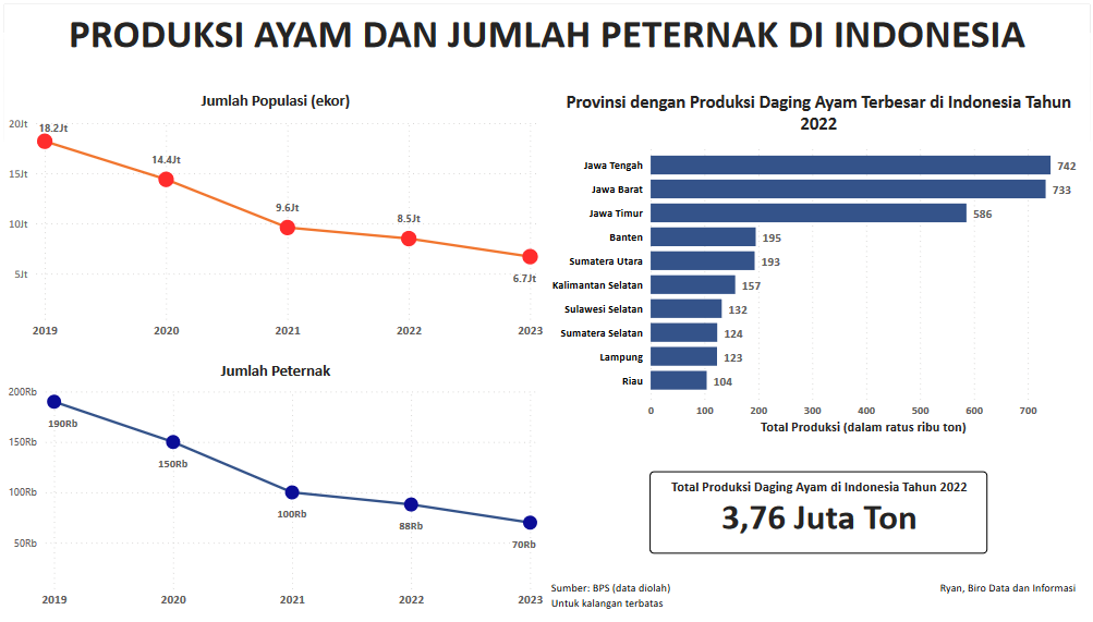 Visualisasi ini menampilkan beberapa data diantaranya yaitu jumlah populasi ayam dalam satuan ekor, jumlah peternak di Indonesia dalam kurun waktu lima tahun terakhir, dan data provinsi dengan produksi daging ayam terbesar di Indonesia tahun 2022.