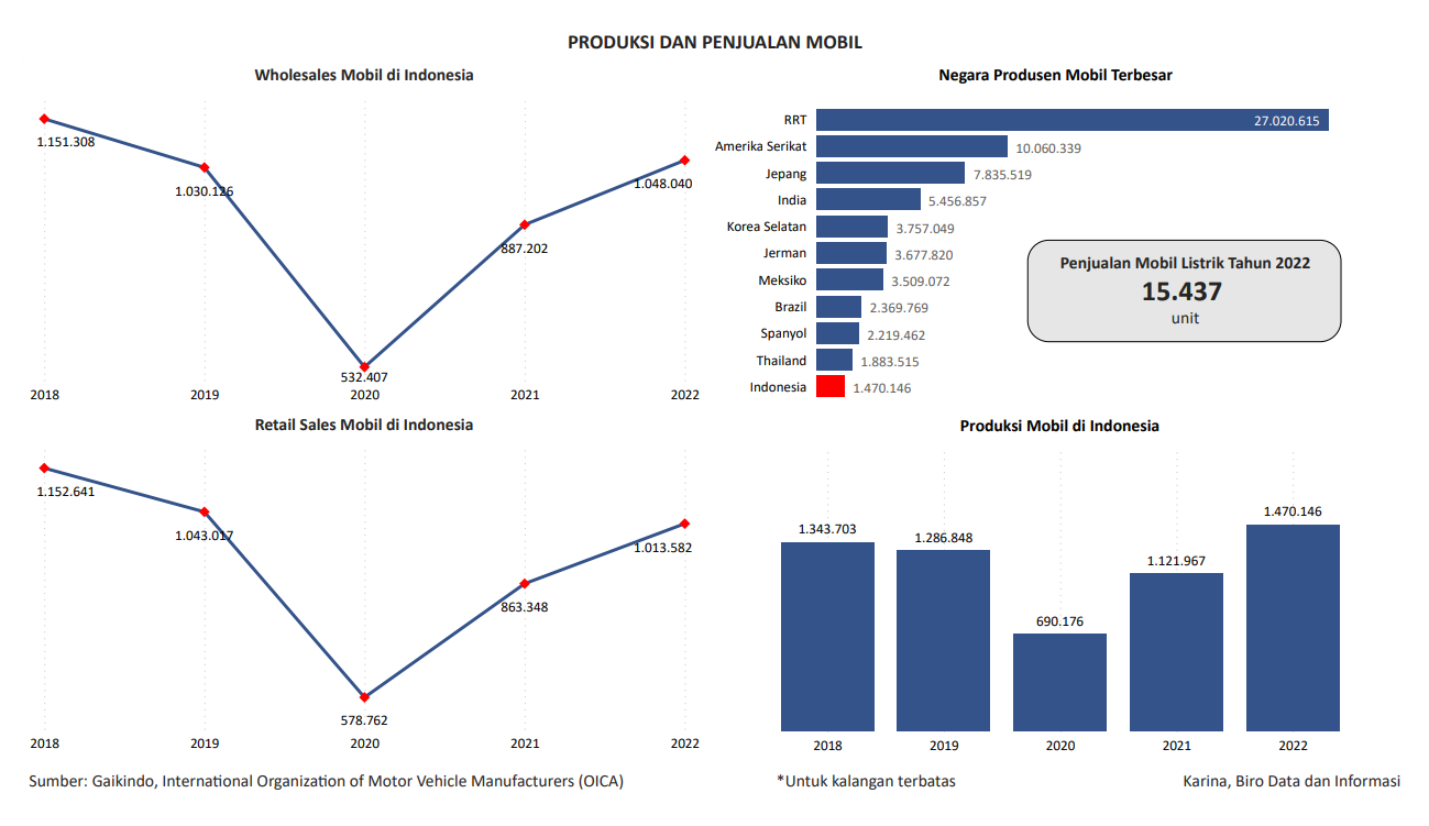 Visualisasi ini menampilkan data penjualan mobil baik wholesales maupun retail sales, produksi mobil di Indonesia, dan 11 negara produsen mobil terbesar. Data bersumber dari Gaikindo dan International Organization of Motor Vehicle Manufacturers (OICA).