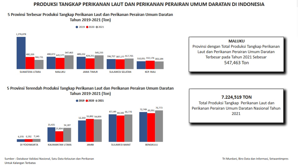Data visualisasi ini menyajikan tentang 5 Provinsi tertinggi dan terendah pada produksi tangkap perikanan laut dan perikanan perairan umum darat di Indonesia tahun 2019-2021 serta Provinsi dan nasional dengan total produksi tangkap perikanan laut dan perikanan perairan umum darat di Indonesia pada tahun 2021.