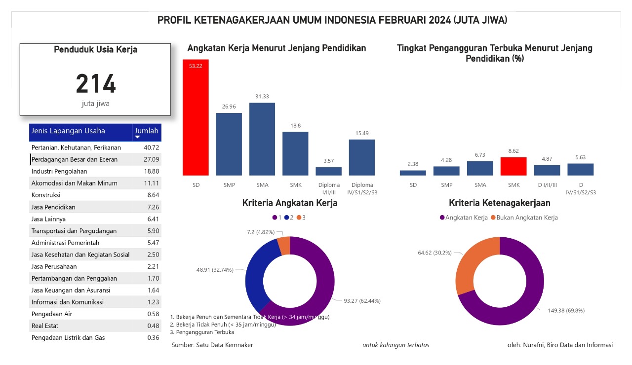 Visualisasi menampilkan profil ketenagakerjaan umum Indonesia per Februari 2024. Data menunjukkan jumlah penduduk usia kerja adalah 214 juta jiwa. Diantara 214 juta jiwa tersebut yang meruupakan angkatan kerja sebanya 149,38 juta jiwa atau sebanyak 69,8% dan bukan angkatan kerja sebanyak 64,62 juta jiwa atau 30,2%. Angkatan kerja ini didominasi oleh lulusan SD sebanyak 53,22 juta jiwa, kemudian diikuti oleh lulusan SMA dan SMP sebanyak 31,33 juta jiwa dan 26,96 juta jiwa.