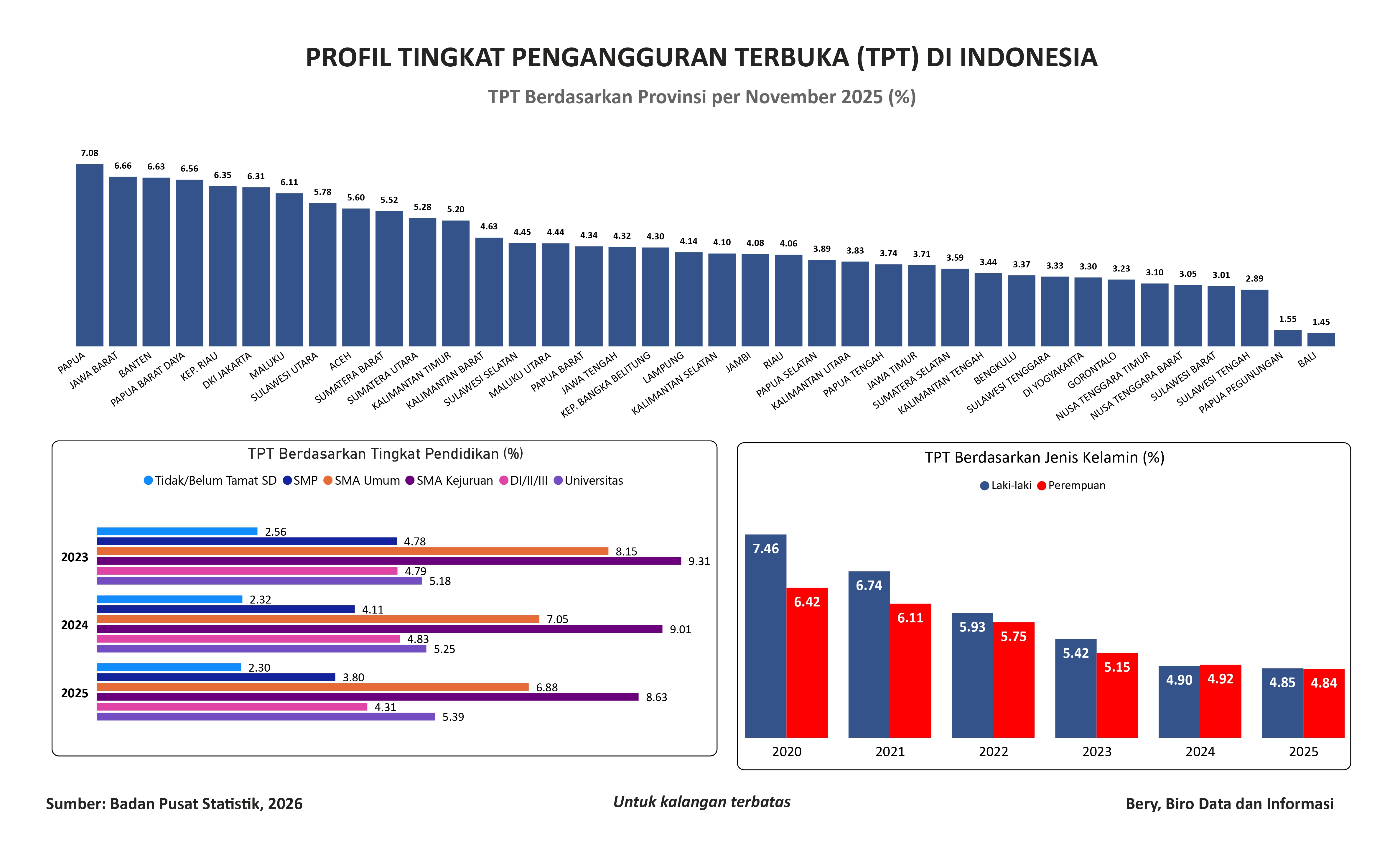 Visualisasi ini menampilkan tingkat pengangguran terbuka di Indonesia berdasarkan provinsi, tingkat pendidikan, dan jenis kelamin. Data dapat diakses melalui laman resmi Badan Pusat Statistik (BPS). Data yang ditampilkan merupakan data per November 2025.