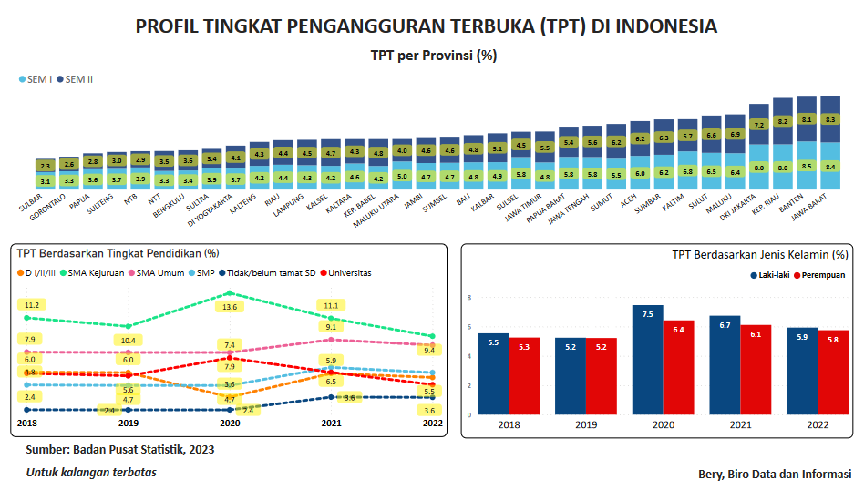 Visualisasi ini menampilkan tingkat pengangguran terbuka di Indonesia berdasarkan provinsi, tingkat pendidikan, dan jenis kelamin. Data dapat diakses melalui laman resmi Badan Pusat Statistik (BPS). Data yang ditampilkan merupakan data per Januari 2023.
