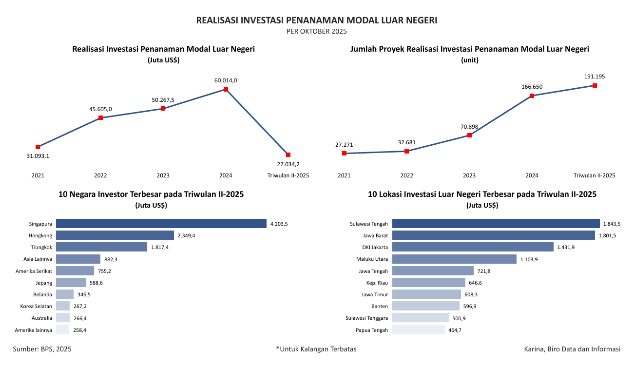 Visualisasi ini menampilkan data mengenai realisasi investasi penanaman modal luar negeri, jumlah proyek realisasi investasi penanaman modal luar negeri , 10 negara investor terbesar pada triwulan II-2025, dan 10 lokasi investasi luar negeri terbesar pada triwulan II-2025. Data bersumber dari BPS.