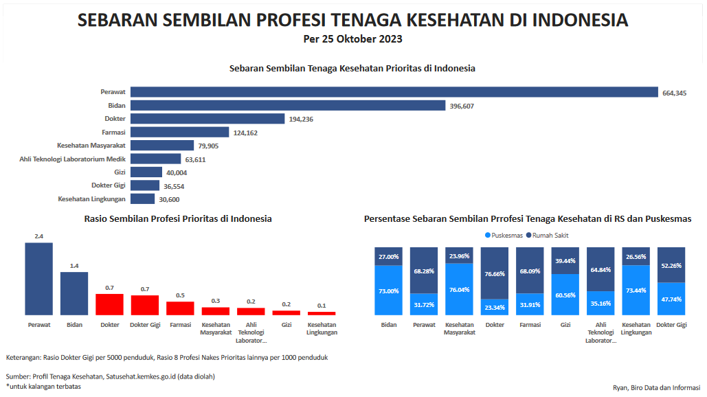 Visualisasi ini menampilkan beberapa diagram yang terdiri dari sebaran sembilan tenaga kesehatan (nakes) prioritas di Indonesia, Rasio Sembilan Profesi Nakes Prioritas, serta Persentase Sebaran Profesi Nakes di Rumah Sakit dan Puskesmas di Indonesia. Sumber berasal dari Profil Tenaga Kesehatan SatuSehat Kementerian Kesehatan.