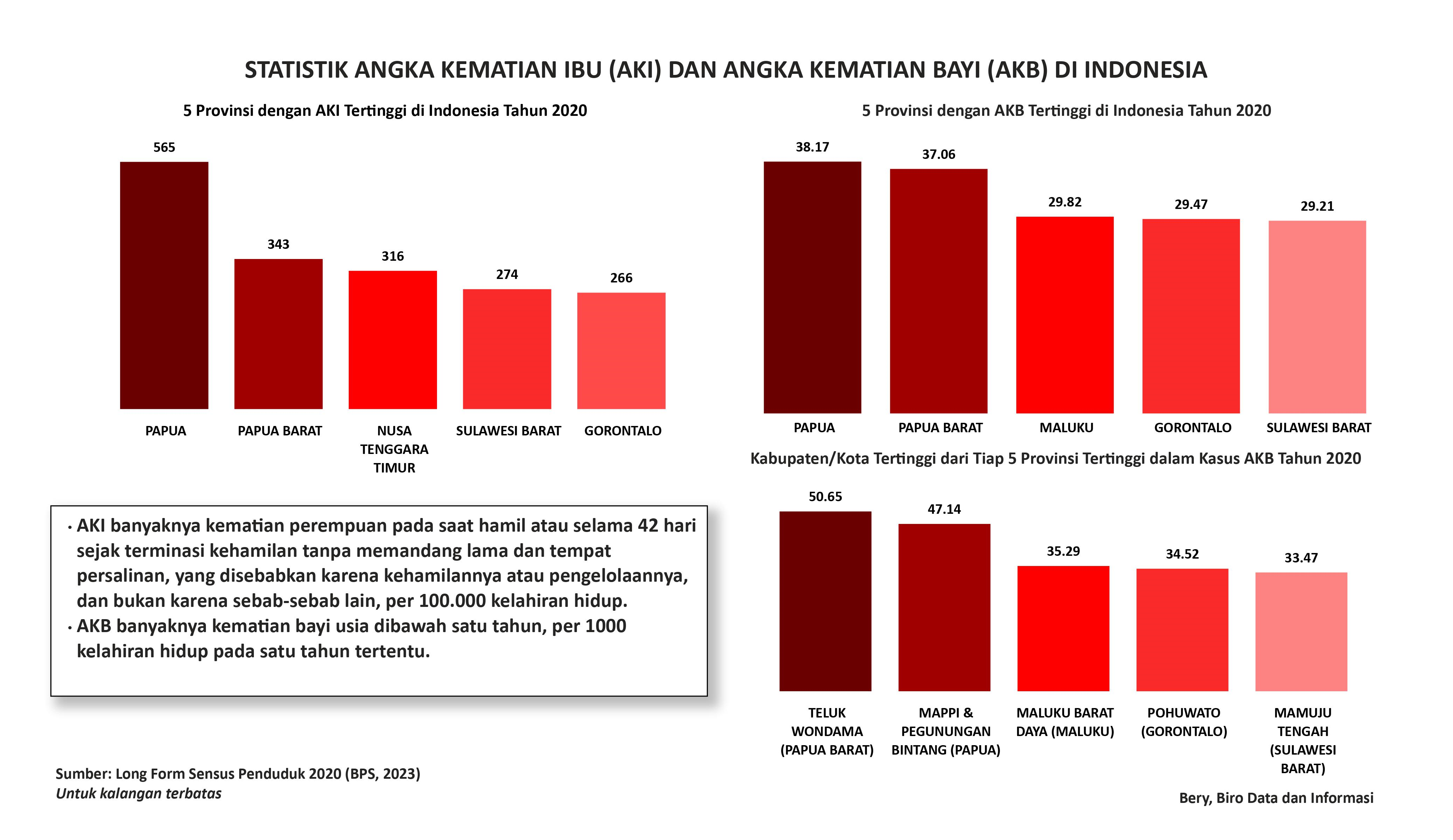 Visualisasi ini menampilkan statistik dari data angka kematian ibu (AKI) dan angka kematian bayi (AKB) di Indonesia pada tahun 2020. Data tersebut menampilkan 5 provinsi di Indonesia dengan AKI dan AKB tertinggi, serta Kabupaten/Kota dengan AKI dan AKB tertinggi di masing-masing provinsi tersebut. Data tersebut diperoleh dari Long Form Sensus Penduduk tahun 2020 yang diperbaharui BPS pada tahun 2023.