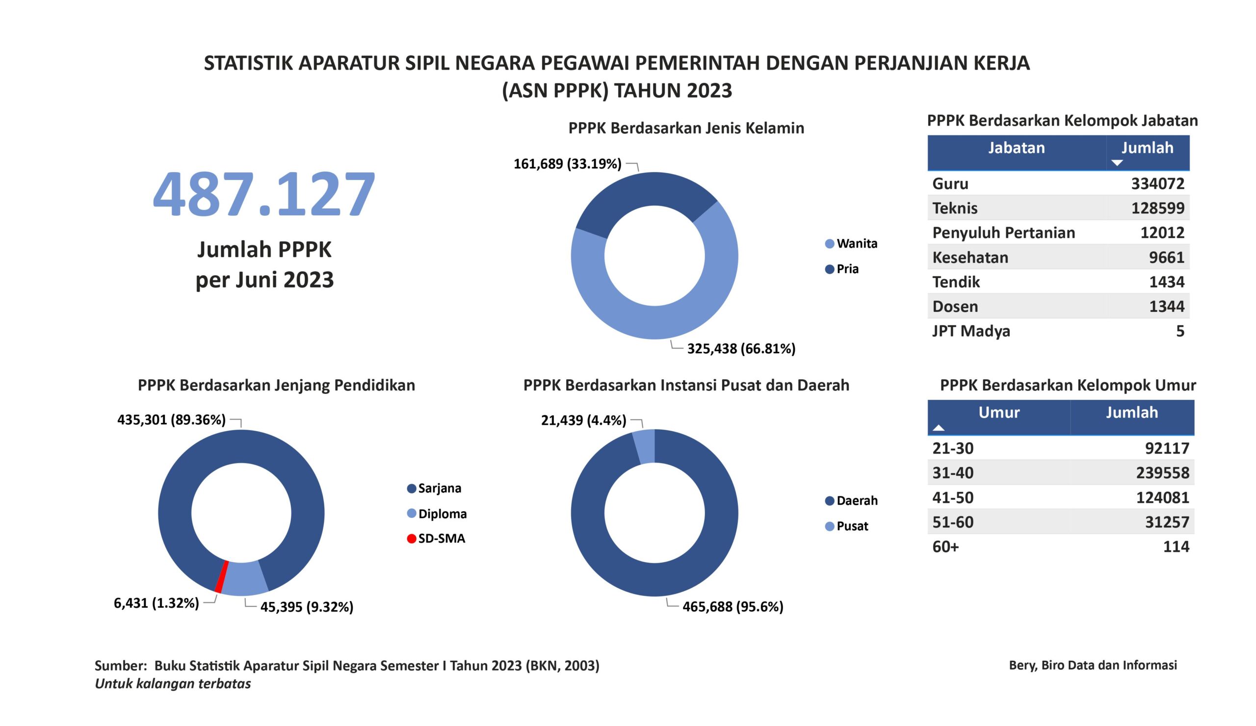 Visualisasi ini menampilkan statistik dari data Aparatur Sipil Negara Pegawai Pemerintah dengan Perjanjian Kerja (ASN PPPK) Indonesia tahun 2023. Dari data tersebut diperoleh informasi bahwa ASN PPPK yang paling banyak merupakan kelompok jabatan guru dan bekerja untuk instansi pemerintahan daerah. Data diperoleh dari Buku Statistik Aparatur Sipil Negara Tahun 2023 yang dirilis Badan Kepegawaian Negara (BKN).