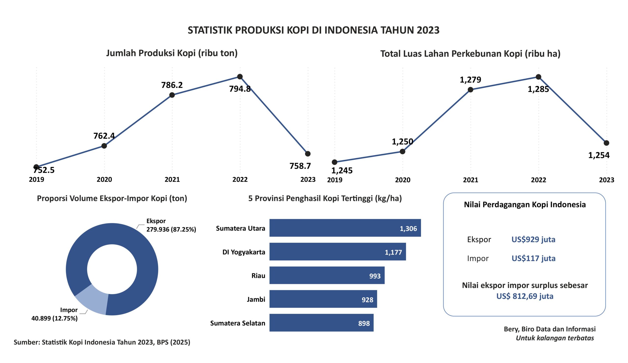 Visualisasi ini menampilkan statistik kopi di Indonesia tahun 2023, diantaranya berupa data jumlah produksi kopi, total luas lahan perkebunan kopi, volume dan nilai ekspor-impor kopi Indonesia, serta lima provinsi penghasil kopi tertinggi. Data diperoleh dan dapat diakses melalui laman BPS. Data yang ditampilkan berdasarkan update per November 2024 dan diakses pada September 2025.