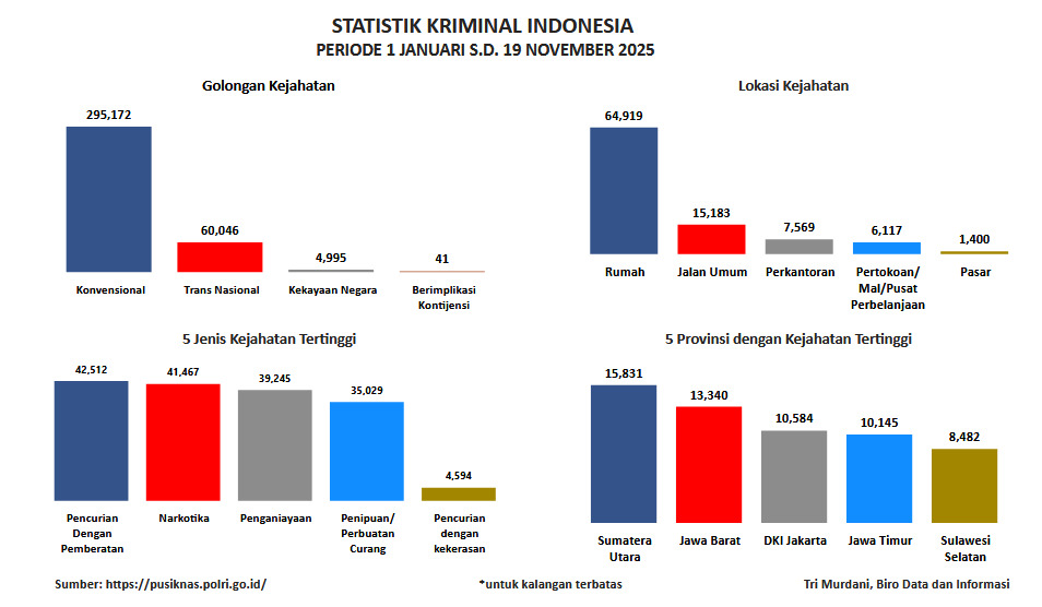 Jenis kejahatan tertinggi di Indonesia di Indonesia sampai dengan November 2025 adalah Pencurian dengan pemberatan dengan jumlah kejadian 42.512. Kemudian provinsi dengan kejadian kriminalitas tertinggi adalah Sumatera Utara dengan jumlah kejadian 15.831. Data tersebut diperoleh dari pusiknas.polri.go.id per 19 November 2025.