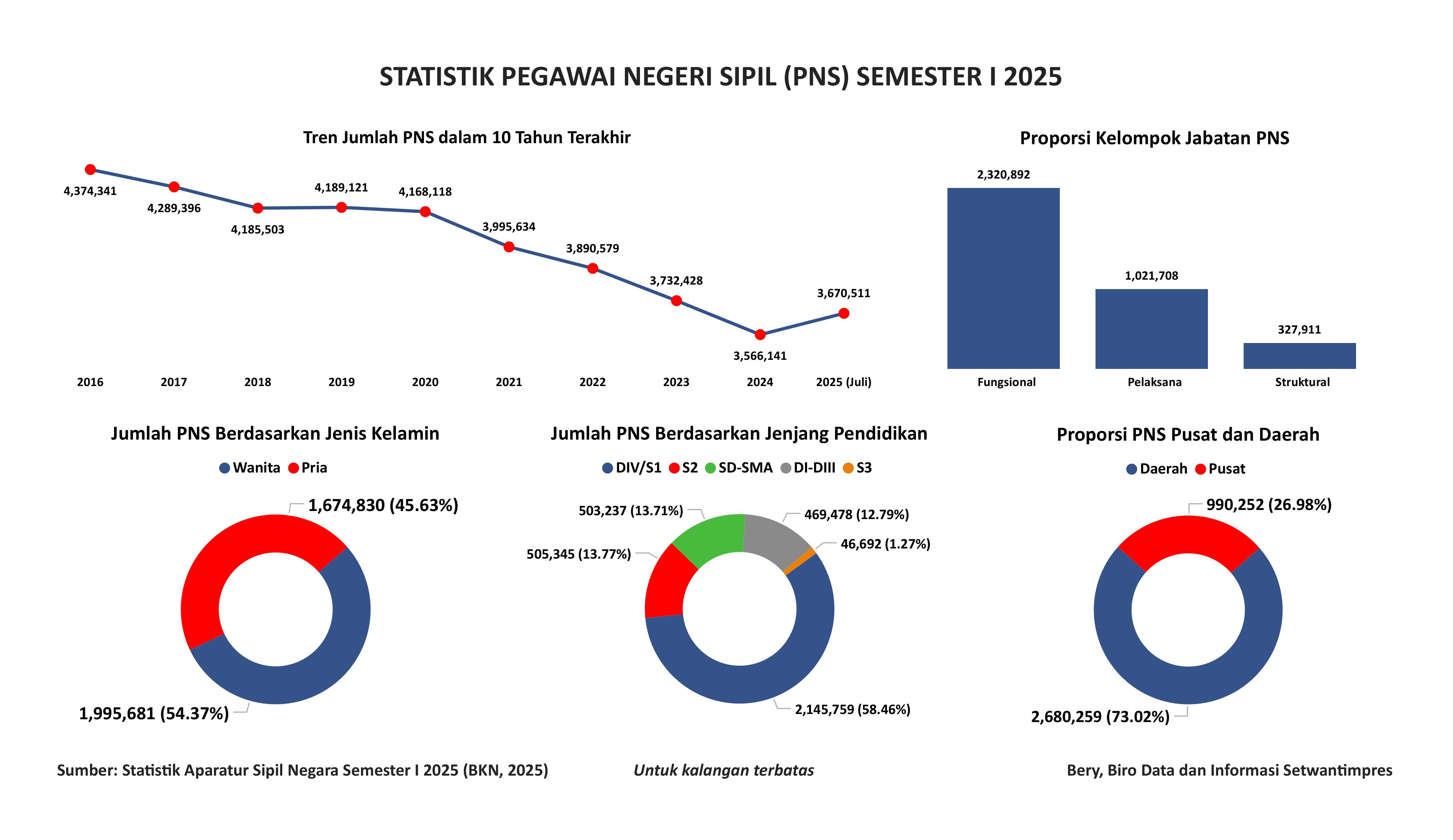 Visualisasi ini menampilkan statistik dari data pegawai negeri sipil (PNS) Indonesia pada Semester I tahun 2025. Dari visualisasi tersebut, terlihat bahwa terjadi tren jumlah PNS dalam 10 tahun terakhir dan kategori kelompok jabatan struktural, fungsional dan pelaksana. Data diperoleh dari Buku Statistik Aparatur Sipil Negara Semester I 2025 yang dirilis Badan Kepegawaian Negara (BKN).