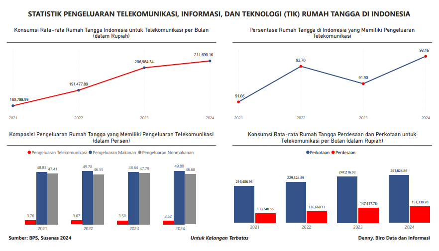 Pada tahun 2024, rata-rata pengeluaran rumah tangga untuk telekomunikasi mencapai 212 ribu rupiah per bulan atau setara 3,52 persen dari total pengeluaran. Hal ini menjadi indikator bahwa telekomunikasi telah menjadi komponen tetap dan signifikan dalam struktur pengeluaran rumah tangga di Indonesia. Persentase pengeluaran yang stabil di kisaran 3,5 persen selama periode 2021-2024 menjadi gambaran bahwa kebutuhan terhadap akses komunikasi dan konektivitas digital tetap konsisten, seiring dengan meningkatnya ketergantungan pada dua komponen tersebut untuk bekerja, belajar, dan menjalankan interaksi sosial.