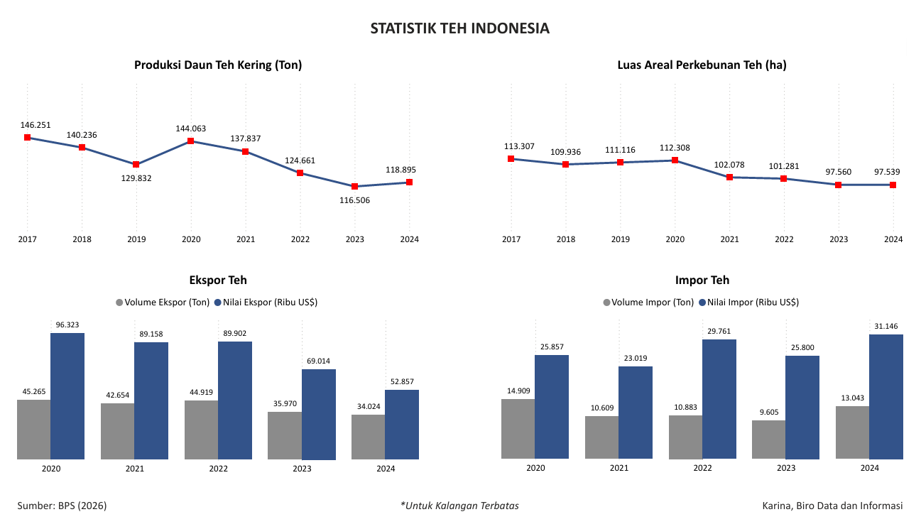 Visualisasi ini menampilkan data Produksi Daun Teh Kering, Luas Areal Perkebunan Teh, Ekspor Teh, dan Impor Teh. Data bersumber dari BPS.