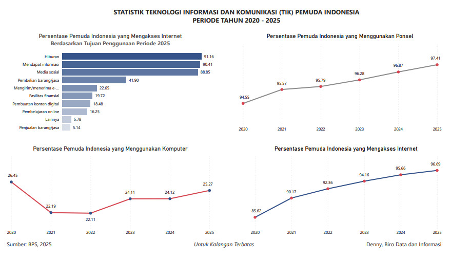 Statistik ini menggambarkan persentase penggunaan komputer dan ponsel oleh para pemuda di Indonesia, serta jumlah angkatan muda yang mengakses internet beserta tujuan mengaksesnya. Terlihat bahwa persentase pengguna komputer jauh lebih rendah dibandingkan dengan pengguna telepon seluler dengan margin sebesar 72,14% di tahun 2025. Menurut BPS, hanya sekitar 1 dari 4 pemuda di Indonesia yang menggunakan komputer. Hal ini kemungkinan disebabkan karena fungsi-fungsi komputasi juga dapat dilakukan oleh perangkat seluler. Terkait dengan tujuan akses internet yang mayoritas hanya untuk hiburan, BPS menyatakan perlunya peningkatan literasi digital dan penguatan keterampilan TIK agar pemuda tidak hanya menjadi konsumen digital, tetapi juga produsen dan inovator dalan ekosistem digital.
