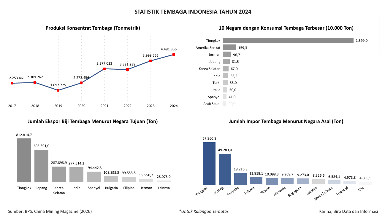 Visualisasi ini menampilkan data Produksi Konsentrat Tembaga, 10 Negara dengan Konsumsi Tembaga Terbesar, Jumlah Ekspor Biji Tembaga Menurut Negara Tujuan, dan Jumlah Impor Tembaga Menurut Negara Asal. Data bersumber dari BPS dan China Mining Magazine.