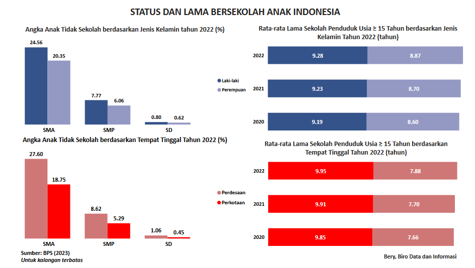 Visualisasi ini menampilkan data angka anak tidak bersekolah serta rata-rata lama anak berusia +15 tahun bersekolah berdasarkan jenis kelamin dan tempat tinggal. Data diperoleh dan dapat diakses melalui laman BPS. Data yang ditampilkan berdasarkan update per Juli 2023.