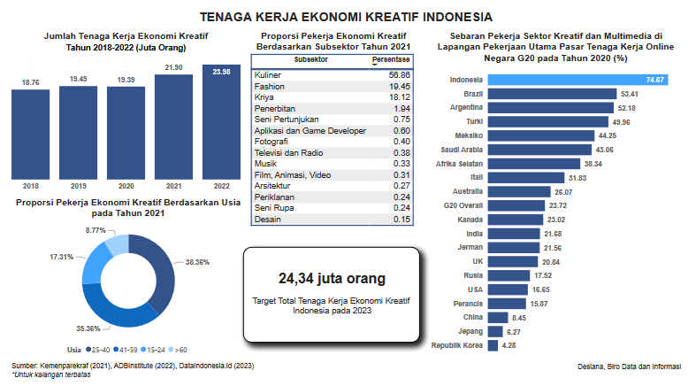 Visualisasi ini menampilkan data jumlah tenaga kerja ekonomi kreatif pada tahun 2018-2022, proporsi pekerja ekonomi kreatif berdasarkan subsektor dan usia tahun 2021, dan sebaran pekerja sektor kreatif dan multimedia di lapangan pekerjaan utama pasar tenaga kerja online negara G20 tahun 2020. Data dapat diakses melalui DataIndonesia.id, Laporan Kemenparekraf dan ADBInstitute. Data yang ditampilkan update per Oktober 2023.