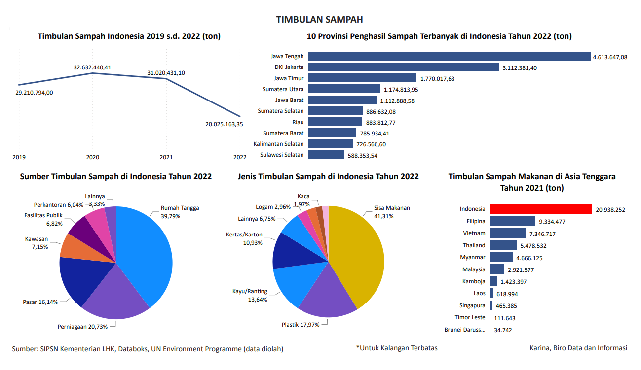 Visualisasi ini menampilkan data timbulan sampah Indonesia, 10 provinsi penghasil sampah terbanyak di Indonesia, sumber timbulan sampah, jenis timbulan sampah, dan timbulan sampah makanan di Asia Tenggara. Data bersumber dari SIPSN Kementerian LHK, Databoks, dan UN Environment Programme.