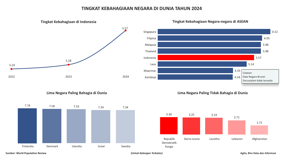 Visualisasi ini menyajikan data terkait tingkat kebahagiaan di Indonesia untuk periode 2022 s.d. 2024, selain itu menampilkan data mengenai lima negara yang paling bahagia dan paling tidak bahagia di dunia, dan tingkat kebahagiaan di negara-negara ASEAN pada 2024. Dari visualisasi ini dapat dilihat Indonesia bukanlah negara paling bahagia di kawasan ASEAN, Indonesia hanya menang dari Laos, Myanmar dan Kamboja. Sedangkan Israel berhasil menjadi salah satu dari lima negara yang paling berbahagia di dunia pada 2024. Tingkat kebahagiaan negara ini, diukur menggunakan enam kategori termasuk PDB per kapita, dukungan sosial, dan harapan hidup sehat, kebebasan untuk membuat keputusan, persepsi korupsi, kesengsaraan.