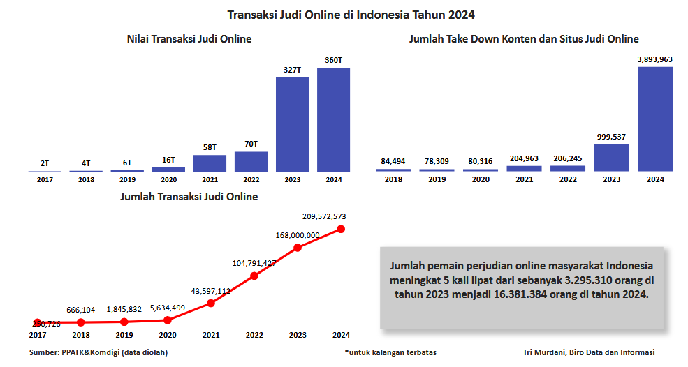 Merujuk data Pusat Pelaporan dan Analisis Transaksi Keuangan (PPATK), total perputaran uang dari judi daring atau online mencapai Rp327 triliun di tahun 2023 meningkat Rp360 T di tahun 2024. Begitu juga Jumlah pemain perjudian online masyarakat Indonesia meningkat 5 kali lipat dari sebanyak 3.295.310 orang di tahun 2023 menjadi 16.381.384 orang di tahun 2024.