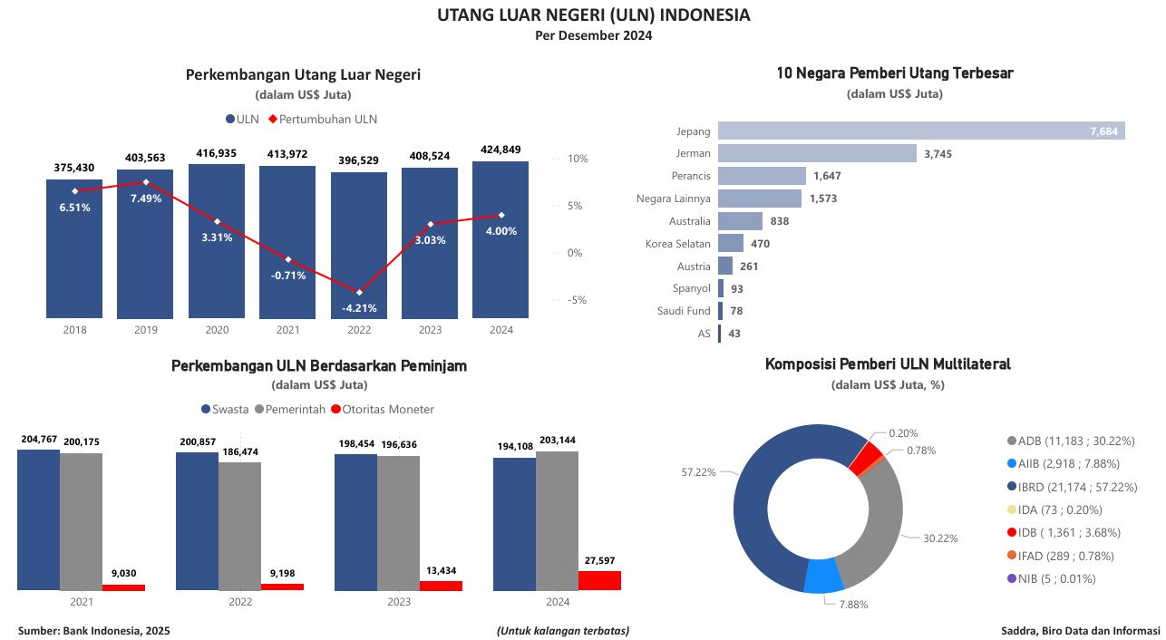 Visualisasi yang ditampilkan data realisasi dan perkembangan utang luar negeri Indonesia, serta realiasasi utang berdasarkan kelompok peminjam dan pemberi utang . Data dapat diakses melalui website Bank Indonesia. Data yang ditampilkan angka sangat sementara update bulan Desember 2024