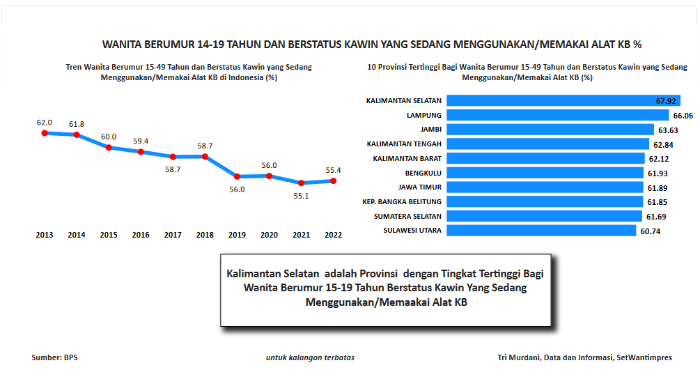 Data Visualisasi ini menyajikan terkait presentase wanita berumur 14-19 tahun dan berstatus kawin yang sedang menggunakan/memakai alat KB yang tertinggi pada 10 Provinsi dan tren pada 10 tahun dari tahun 2013-2022 di Indonesia.