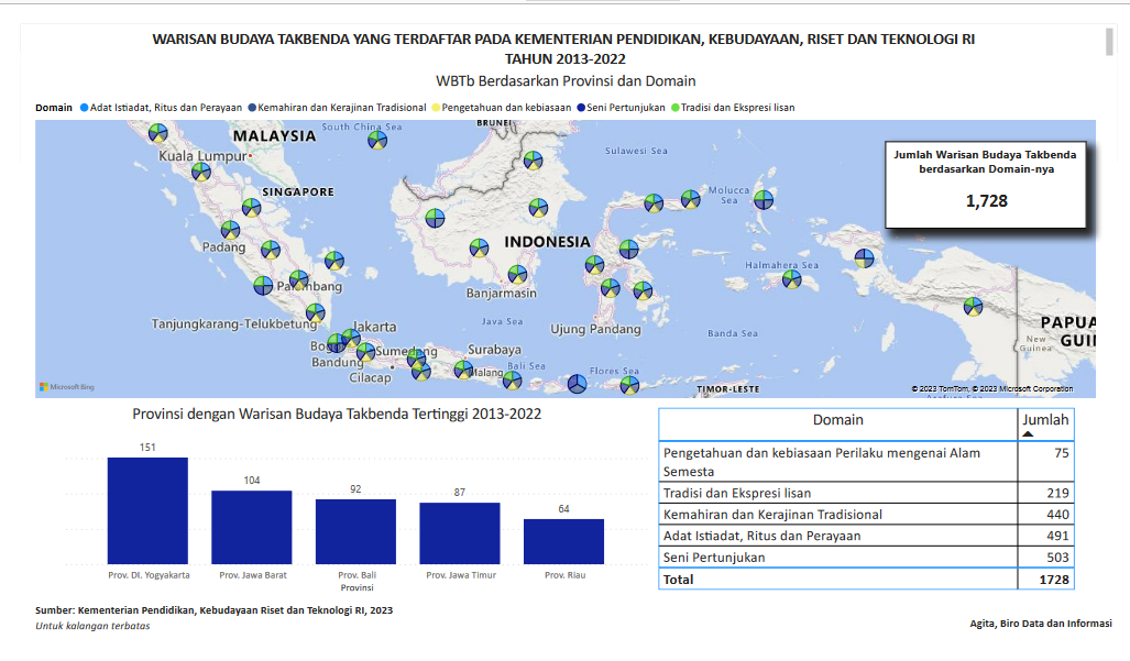 Warisan budaya takbenda (WBTb) adalah praktik, representasi, ekspresi, pengetahuan, atau keterampilan, serta instrumen, objek, artefak, dan ruang budaya yang dianggap oleh UNESCO sebagai bagian dari warisan budaya suatu tempat. Kementerian Pendidikan, Budaya, Riset dan Teknologi melakukan kegiatan pencatatan sejak tahun 2010 dan penetapan atau pendaftaran WBTb sejak tahun 2013. Visualisasi ini menampilkan WBTb yang telah terdaftar pada Kemendikbudristek dari tahun 2013 sampai dengan tahun 2022.